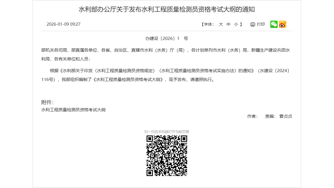 水利部辦公廳關(guān)于發(fā)布水利工程質(zhì)量檢測(cè)員資格考試大綱的通知