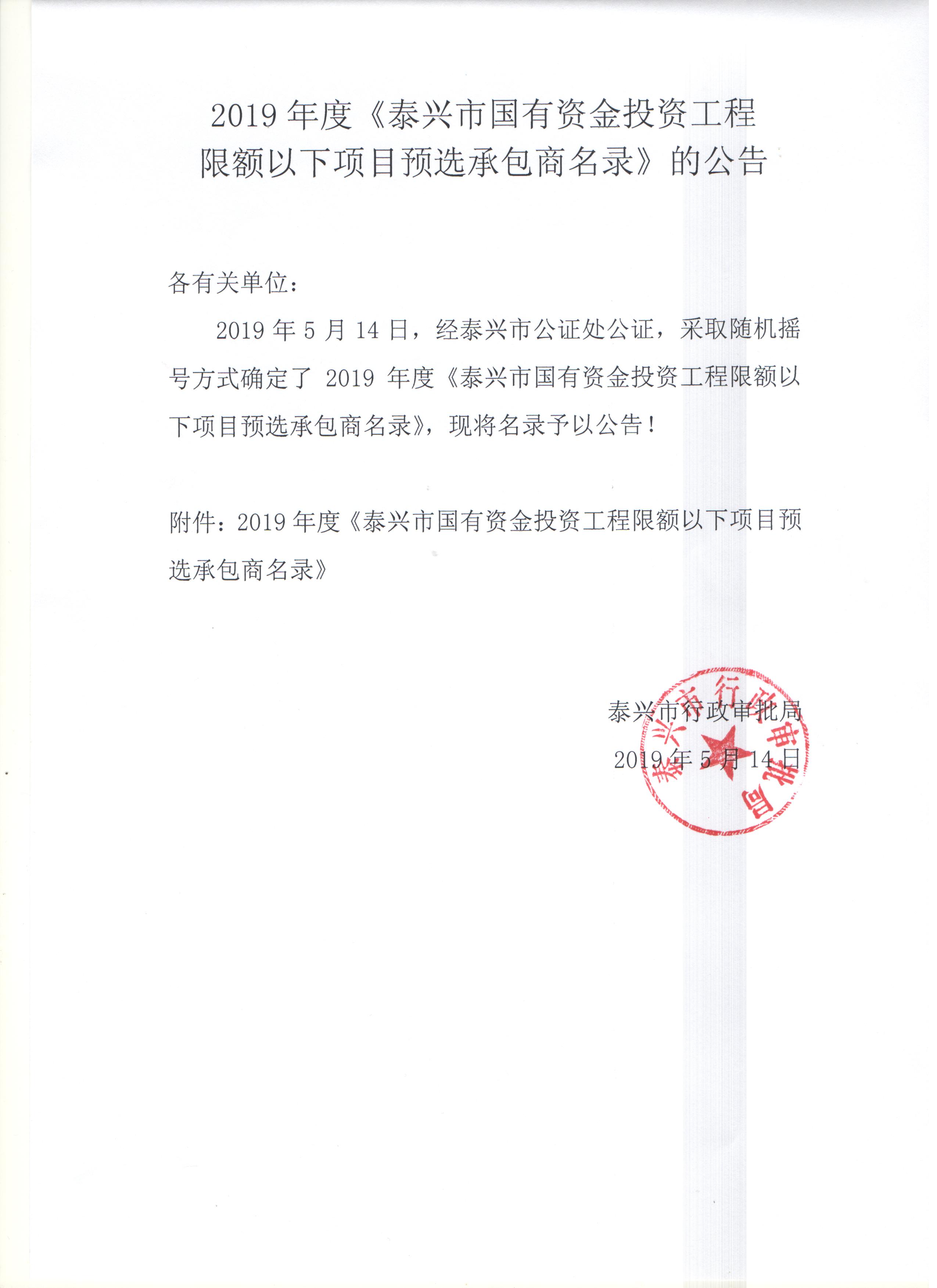 公司入選2019年度《泰興市國有資金投資工程限額以下項目預(yù)選承包商名錄》