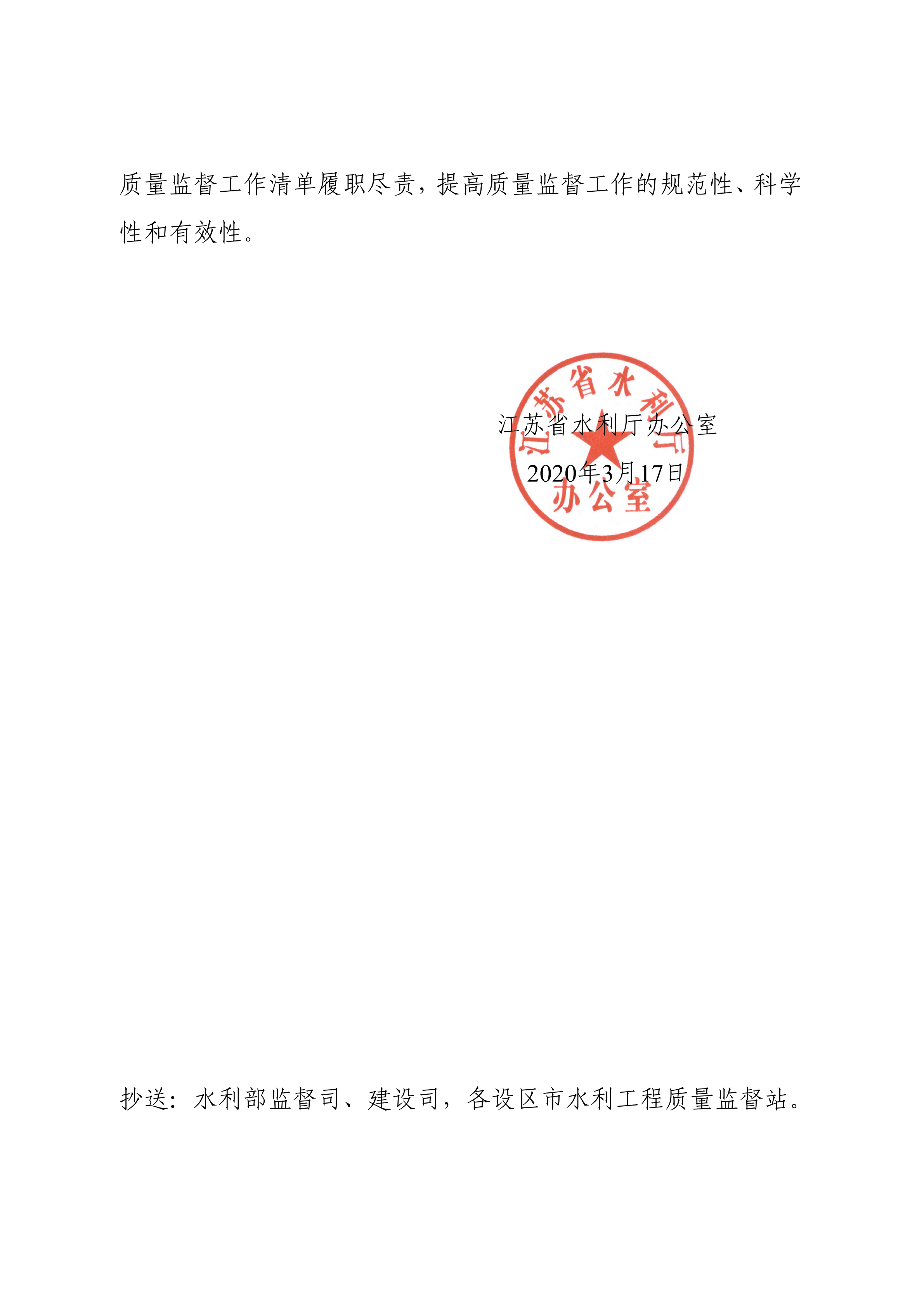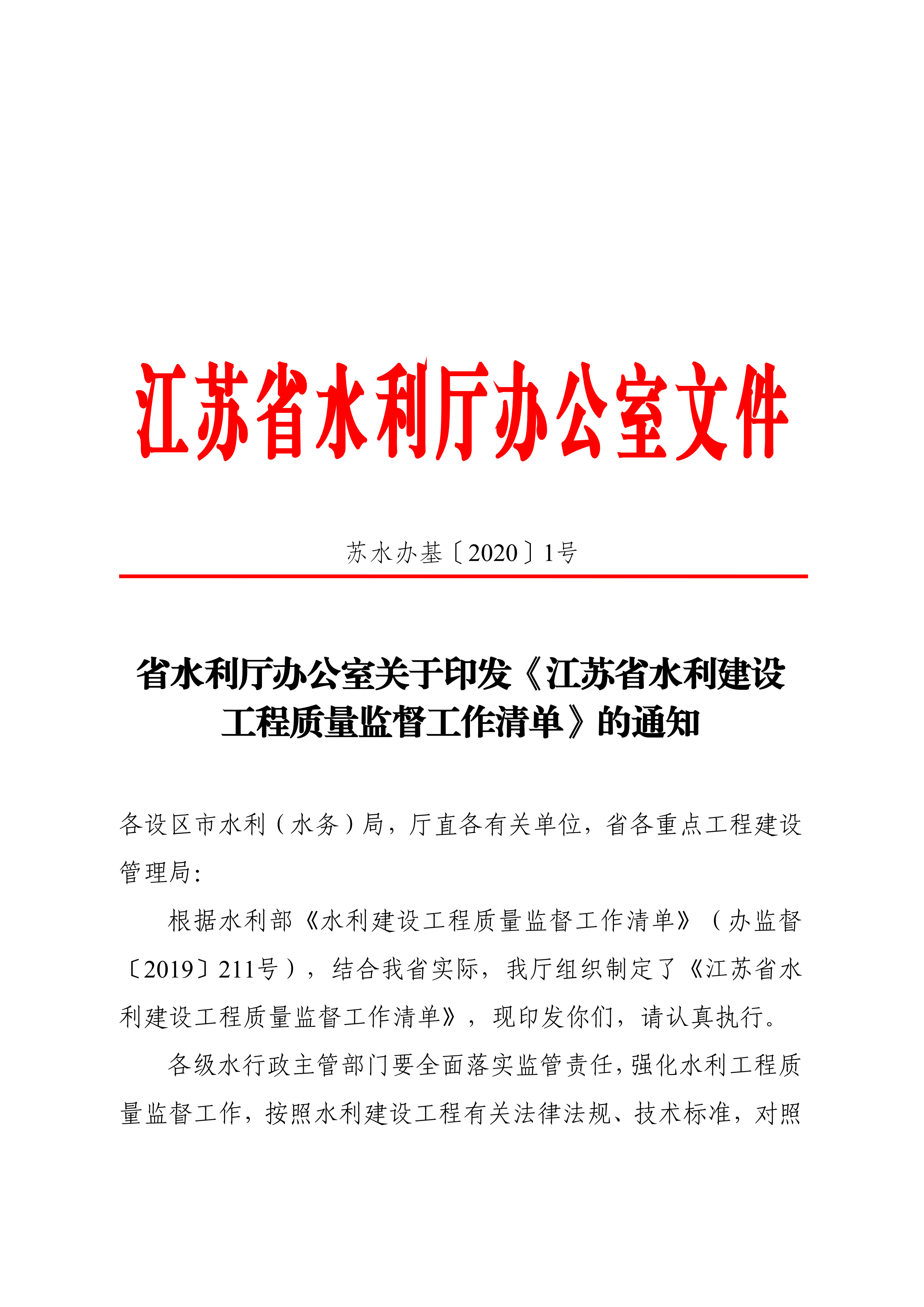 轉:省水利廳辦公室關于印發(fā)《江蘇省水利建設工程質量監(jiān)督工作清單》的通知