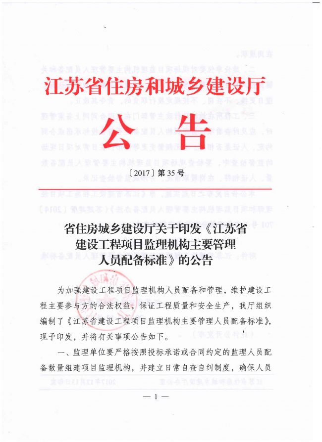 省住房城鄉(xiāng)建設廳關于印發(fā)《江蘇省建設工程項目監(jiān)理機構主要管理人員配備標準》的公告(〔2017〕第35號)