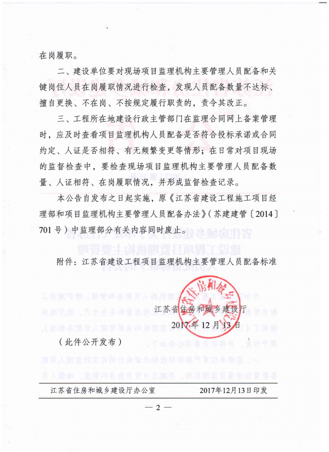 本公告自發(fā)布之日起實施,原《江蘇省建設工程施工項目經理部和項目監(jiān)理機構主要管理人員配備辦法》(蘇建建管〔2014〕701號)中監(jiān)理部分有關內容同時廢止。