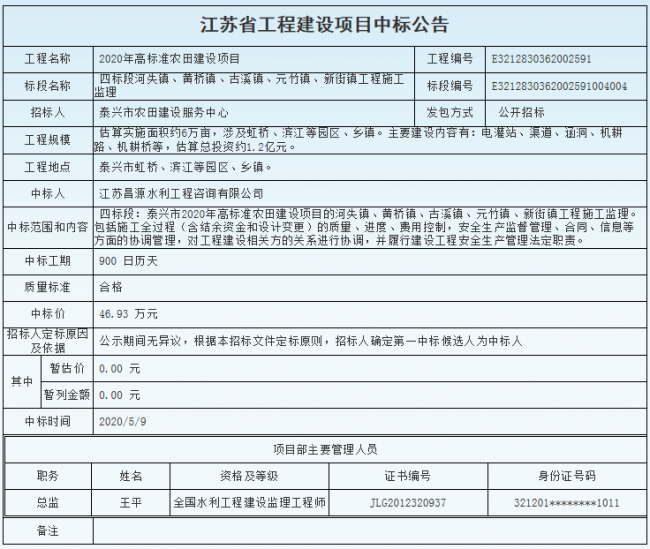 公司中標(biāo)泰興市2019年高標(biāo)準(zhǔn)農(nóng)田建設(shè)項(xiàng)目的施工監(jiān)理三標(biāo)段(虹橋鎮(zhèn)、曲霞鎮(zhèn)、張橋鎮(zhèn))